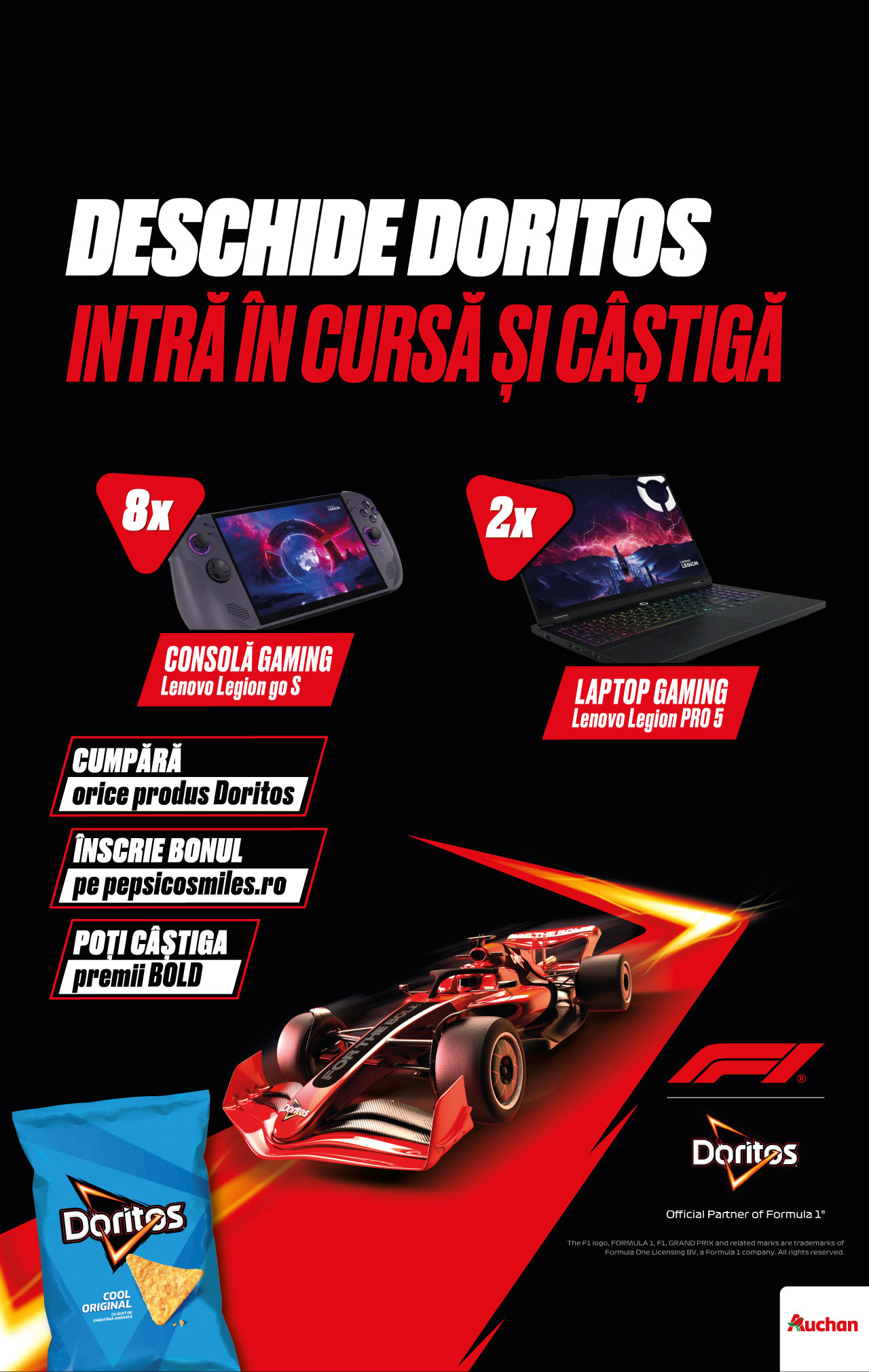Cumpără din magazinele Auchan participante orice produs Doritos, înscrie bonul și poți câștiga prin tragere la sorți, unul dintre cele două laptopuri de gaming Lenovo Legion Pro 5 sau una dintre cele 8 console de gaming Lenovo Legion Go S.