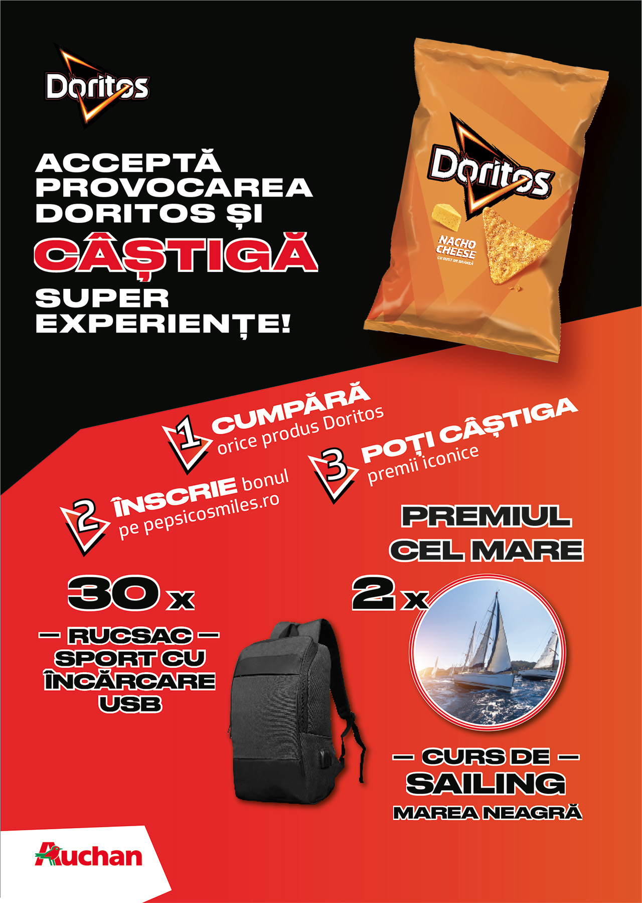 Cumpără din magazinele Auchan participante orice produs Doritos, înscrie bonul și poți câștiga prin tragere la sorți, unul dintre cele 30 de rucsacuri sau marele premiu: unul dintre cele 2 cursuri de sailing pe Marea Neagră.
