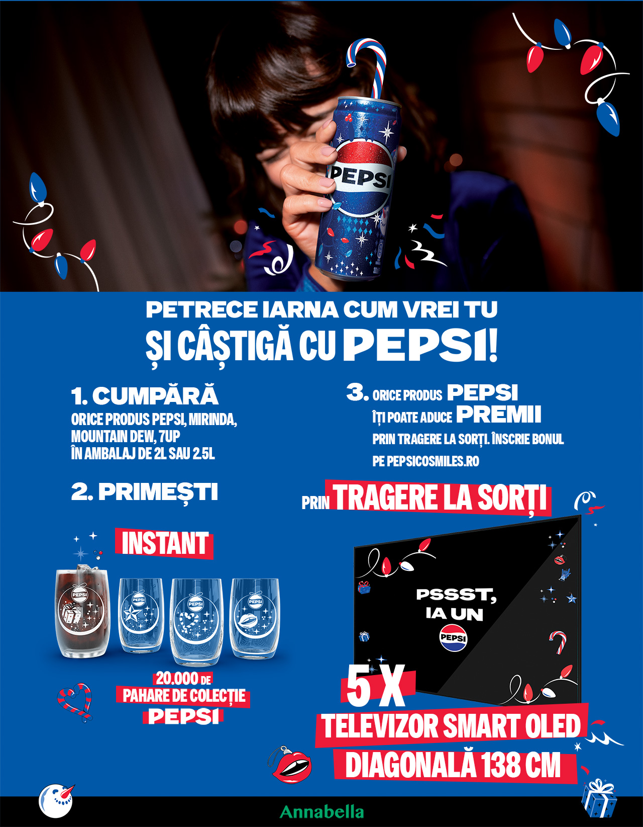Cumpără din magazinele Annabella SRL, detaliate în Regulamentul Campaniei, orice produs Pepsi, Pepsi Zero, Pepsi Twist, Pepsi Twist Zero, Mirinda, Mountain Dew sau 7Up în ambalaj de 2L sau 2.5L și primești un pahar de colecție Pepsi, în limita stocului disponibil în magazin. Suplimentar, pentru orice Pepsi, Pepsi Zero, Pepsi Twist, Pepsi Twist Zero cumpărat, înscrie numărul bonului fiscal și poți câștiga prin tragere la sorți 5x Televizoare Smart, conform mecanismului detaliat în Regulamentul Campaniei.