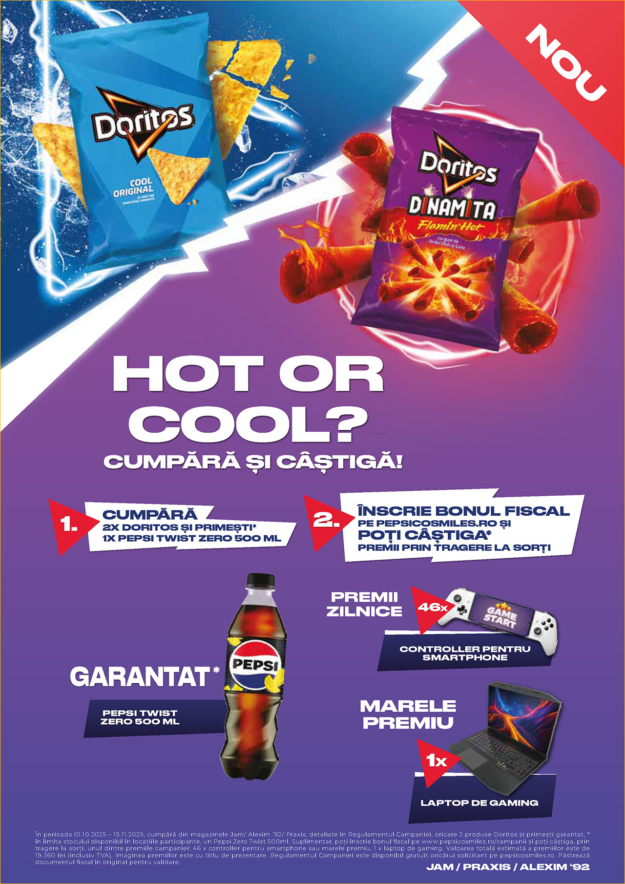 În perioada 01.10.2025 – 15.11.2025, cumpără din magazinele Jam/ Alexim ’92/ Praxis, detaliate în Regulamentul Campaniei, oricare 2 produse Doritos și primești garantat, * în limita stocului disponibil în locațiile participante, un Pepsi Zero Twist 500ml. Suplimentar, poți înscrie bonul fiscal și poți câștiga, prin tragere la sorți, unul dintre premiile campaniei: 46 x controller pentru smartphone sau marele premiu, 1 x laptop de gaming. Valoarea totală estimată a premiilor este de 19.360 lei (inclusiv TVA). Imaginea premiilor este cu titlu de prezentare. Regulamentul Campaniei este disponibil gratuit oricărui solicitant pe pepsicosmiles.ro. Păstrează documentul fiscal în original pentru validare.
