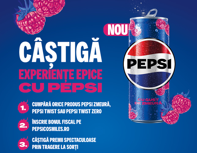 În perioada 15.08.2024 - 09.10.2024 cumpără orice produs din gama Pepsi, Pepsi Zero, Pepsi Twist, Mirinda, 7UP și/sau Mountain Dew din magazinele participante Mega Image menționate în Regulamentul Oficial al Campaniei, înscrie bonul și poți câștiga prin tragere la sorți unul dintre premiile campaniei: Distracție în Tenerife la Siam Park sau săptămânal 10x rucsac de călătorie (Detalii în regulament). Sunt acordate în total 81 de premii iar valoarea estimată este de 45,000.00 lei (TVA inclus). Imaginile premiilor sunt cu titlu de prezentare.