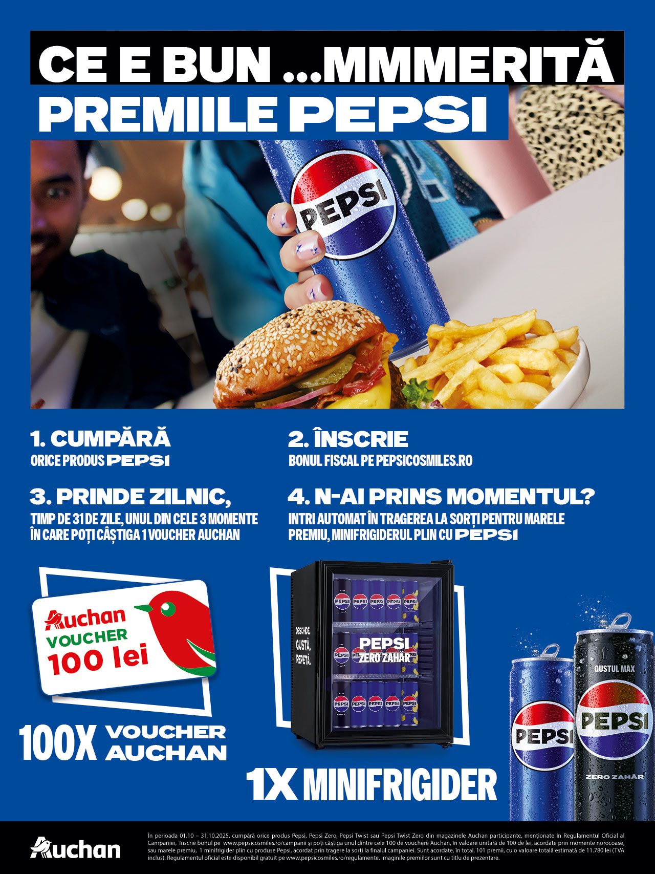 În perioada 01.10 – 31.10.2025, cumpără orice produs Pepsi, Pepsi Zero, Pepsi Twist sau Pepsi Twist Zero din magazinele Auchan participante, menționate în Regulamentul Oficial al Campaniei, înscrie bonul și poți câștiga unul dintre cele 100 de vouchere Auchan, în valoare unitară de 100 de lei, acordate prin momente norocoase, sau marele premiu, 1 minifrigider plin cu produse Pepsi, acordat prin tragere la sorți la finalul campaniei.